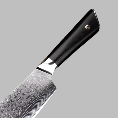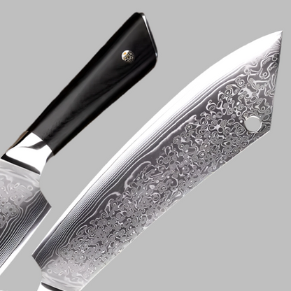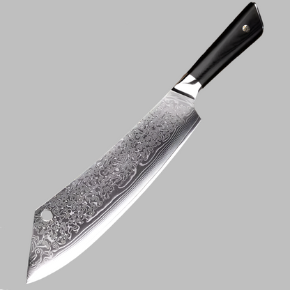 ارفع من مهاراتك في الطهي باستخدام سكين الطاهي كيريتسوكي VG10 الدمشقي مقاس 9.5 بوصة أطلق العنان للإمكانات الحقيقية لمطبخك باستخدام سكين الطاهي مقاس 9.5 بوصة، المصنوع بخبرة من فولاذ دمشقي VG10. تم تصميم سكين كيريتسوكي هذا لأولئك الذين يطلبون الأفضل، حيث يجمع بين دقة ساطور اللحوم ودقة أداة التقطيع، مما يجعله إضافة لا غنى عنها لأي مطبخ. الميزات الرئيسية: شفرة فولاذ دمشقي VG10: مصنوعة من فولاذ دمشقي VG10 الممتاز، تتميز هذه السكين بحدة استثنائية واحتفاظ بالحافة، مما يضمن قطعًا نظيفة وسهلة من خلال اللحوم والأسماك والخضروات. تصميم كيريتسوكي متعدد الاستخدامات: الشفرة مقاس 9.5 بوصة مستوحاة من كيريتسوكي التقليدي، مما يوفر تنوعًا لا مثيل له. سواء كنت تقوم بتقطيع الساشيمي الرقيق أو تقطيع الخضروات القوية، فإن هذا السكين يوفر الدقة والتحكم. مقبض مريح G10: المقبض مصنوع من مادة G10 عالية الجودة، مما يوفر قبضة مريحة وآمنة حتى أثناء الاستخدام لفترة طويلة. متانته ومقاومته للرطوبة تجعله مثاليًا للمطابخ المزدحمة.- الجمالية والأداء: النمط الدمشقي المذهل للسكين وتصميمه الأنيق لا يجعله أداة قوية فحسب، بل إنه أيضًا قطعة فنية، مما يعزز من الجاذبية البصرية لمطبخك. أتقن إبداعاتك الطهوية بسكين الطاهي Kiritsuke VG10 الدمشقي مقاس 9.5 بوصة. إنها أكثر من مجرد سكين - إنها بيان للجودة والحرفية والرقي. اطلب الآن لتجربة أفضل أداء وأناقة في القطع!
