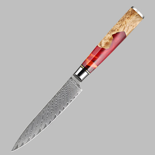 5 Inch Versatile Damascus Utility Kitchen Knife With Red Resin Handle