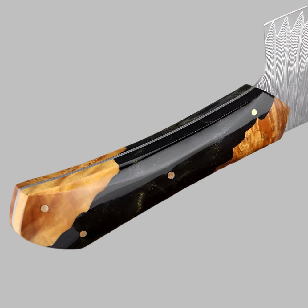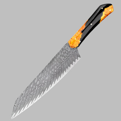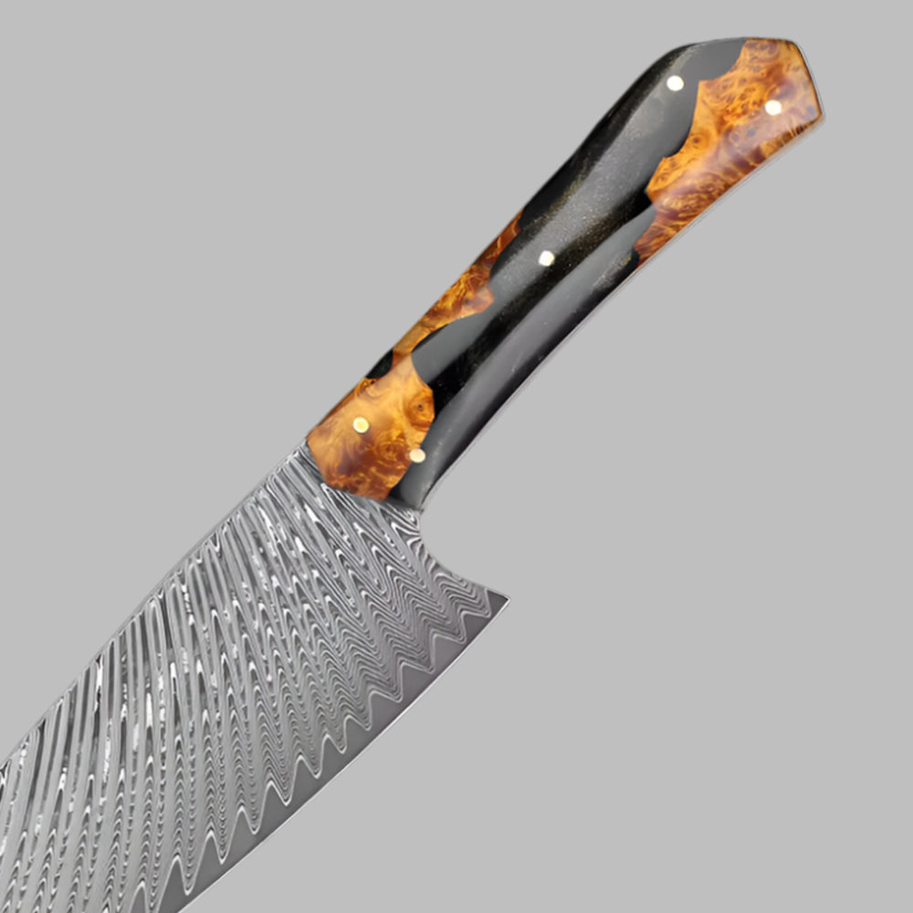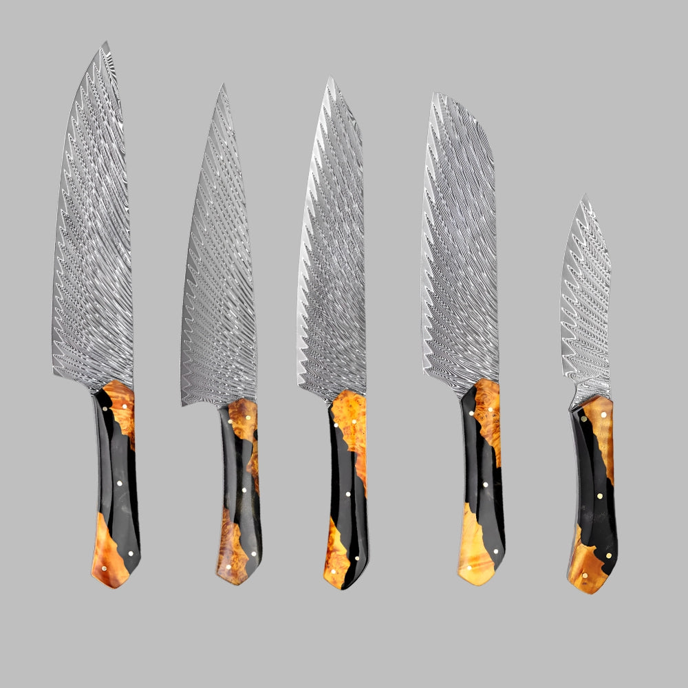 Améliorez vos compétences en cuisine avec cet ensemble de 5 couteaux en acier de Damas méticuleusement conçu pour apporter des performances de qualité professionnelle à votre cuisine. Cet ensemble comprend un couteau de chef de 8 pouces, un couteau à trancher de 7,5 pouces, un couteau Kiritsuke de 8 pouces, un couteau Santoku de 7 pouces et un couteau d'office de 3,5 pouces, chacun conçu de manière experte pour gérer une variété de tâches culinaires avec précision et facilité. Chaque couteau de cet ensemble est forgé à partir d'acier de Damas de qualité supérieure, connu pour son tranchant exceptionnel, sa durabilité et son magnifique motif en couches. Les lames sont affûtées pour obtenir des bords tranchants comme des rasoirs, permettant une coupe, un tranchage, un hachage et un découpage en dés en douceur et sans effort. Les propriétés uniques de l'acier de Damas garantissent que les couteaux conservent leur tranchant plus longtemps, réduisant ainsi le besoin d'affûtage fréquent et offrant des performances constantes au fil du temps. La construction pleine soie de ces couteaux offre un équilibre et un contrôle parfaits, améliorant la stabilité pour une coupe de précision. Associés à des poignées ergonomiques, ces couteaux offrent une prise en main confortable et sûre, minimisant la fatigue des mains même pendant les tâches de cuisine les plus exigeantes. Les poignées sont conçues pour durer et rester froides au toucher, garantissant votre sécurité et votre confort tout au long de chaque préparation de repas. Du couteau de chef polyvalent de 8 pouces, idéal pour hacher et trancher au quotidien, au couteau Kiritsuke spécialisé de 8 pouces pour les coupes complexes, chaque lame de cet ensemble a un but unique. Le couteau à trancher de 7,5 pouces manipule sans effort les viandes et les rôtis, tandis que le couteau Santoku de 7 pouces excelle dans le découpage en dés et le hachage des légumes avec précision. Complétez votre ensemble avec le couteau d'office de 3,5 pouces, parfait pour l'épluchage et les tâches détaillées qui nécessitent du contrôle. Cet ensemble de 5 couteaux en acier de Damas est non seulement un ajout fonctionnel à votre cuisine, mais aussi une œuvre d'art avec ses superbes motifs de Damas. Conçu pour les cuisiniers amateurs et les chefs professionnels, cet ensemble offre des performances, une qualité et un style exceptionnels. Bénéficiant d'une garantie à vie et d'une livraison gratuite, c'est l'investissement ultime en matière d'excellence culinaire. Transformez votre expérience culinaire avec des couteaux qui allient tradition, innovation et savoir-faire artisanal.