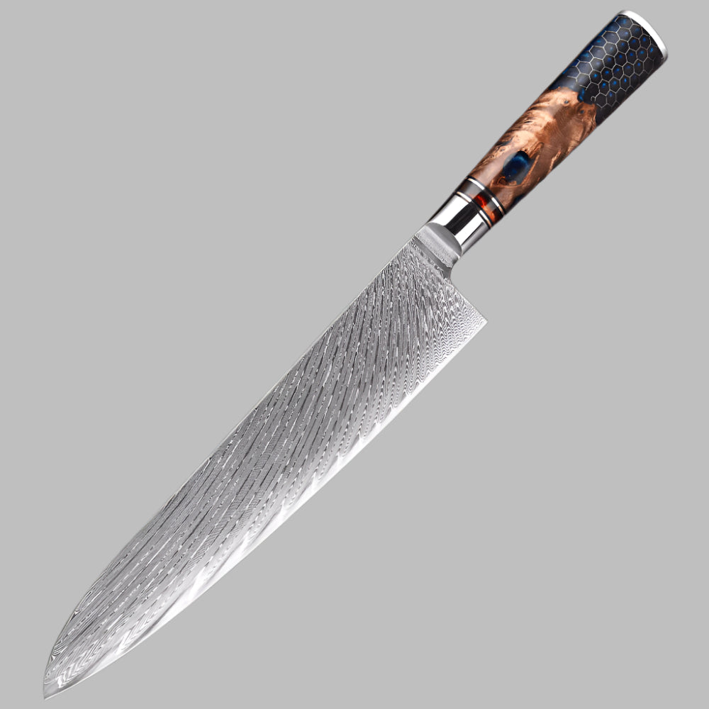 Elevate your culinary experience with our premium 9-piece Damascus Steel Knife Set, expertly crafted to bring precision and elegance to your kitchen. This set features a stunning blue resin honeycomb handle, seamlessly blending modern aesthetics with traditional craftsmanship, designed to enhance your cooking performance.