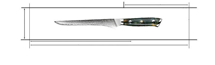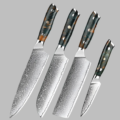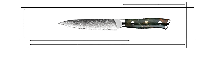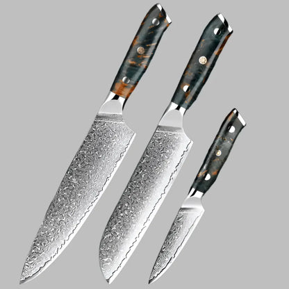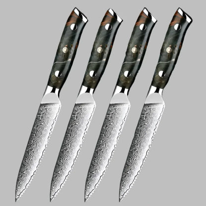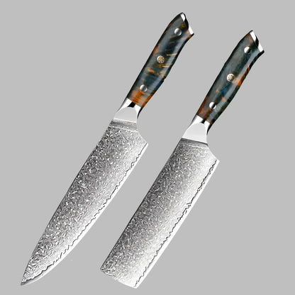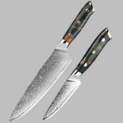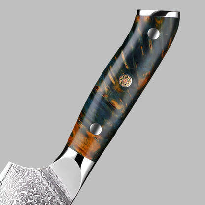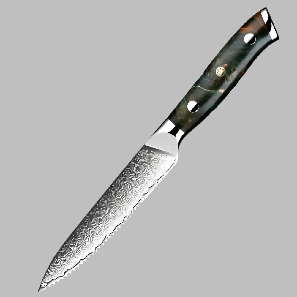 Each blade in this set is forged from high-quality Damascus steel, known for its extraordinary sharpness, durability, and distinctive wave patterns. This luxurious material ensures that your knives maintain a razor-sharp edge, allowing you to slice, dice, and chop with ease.