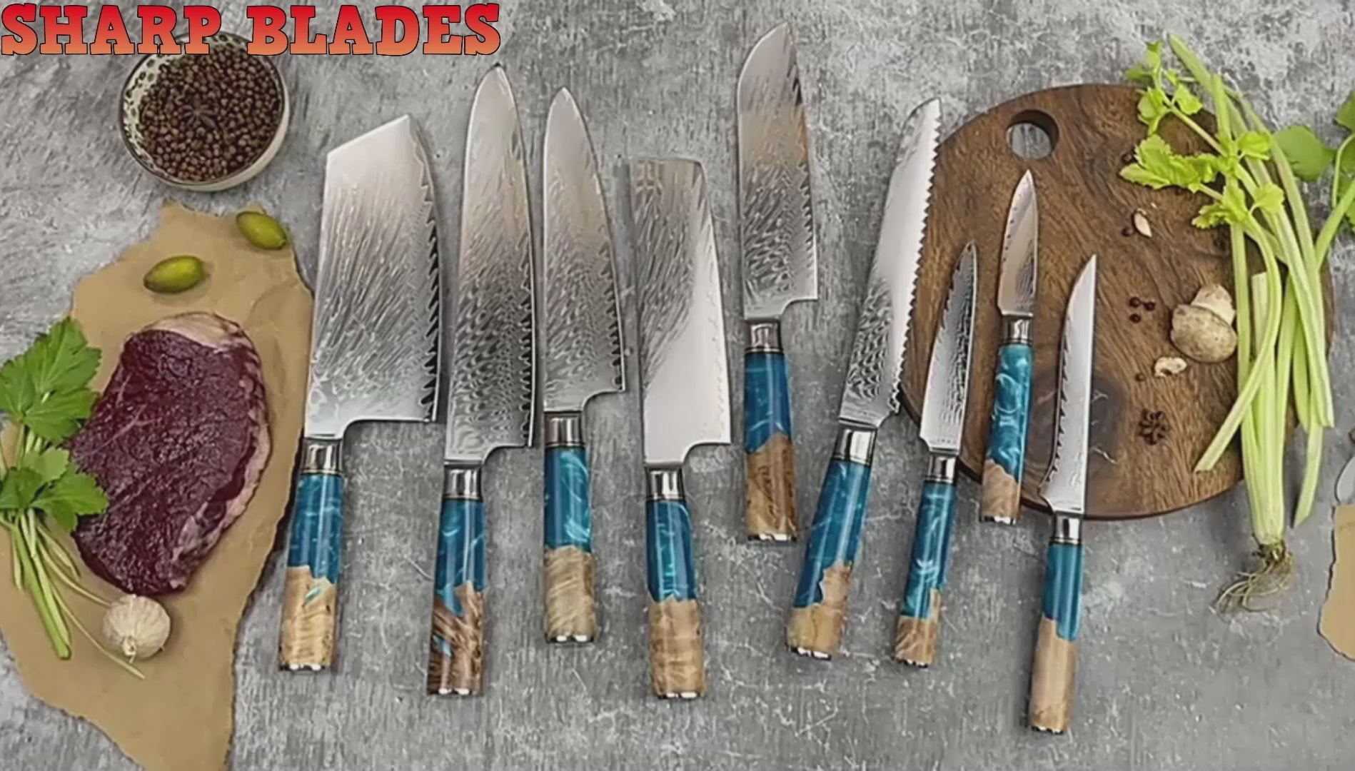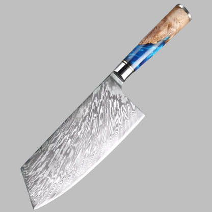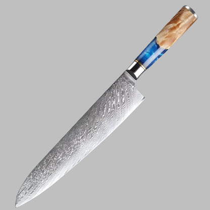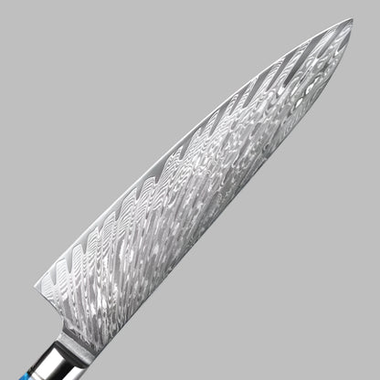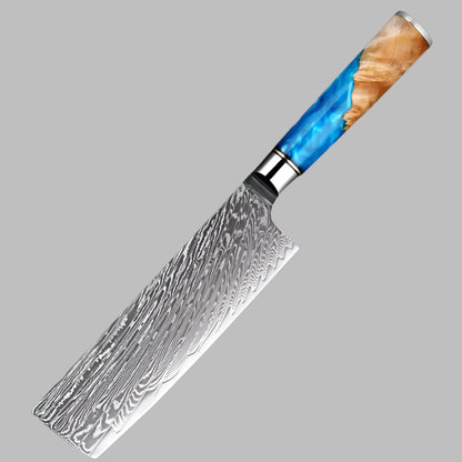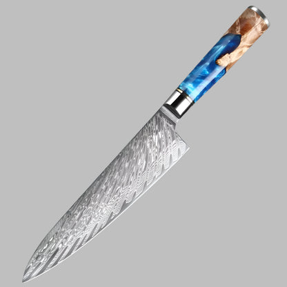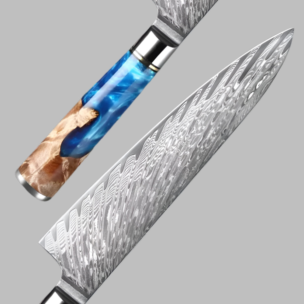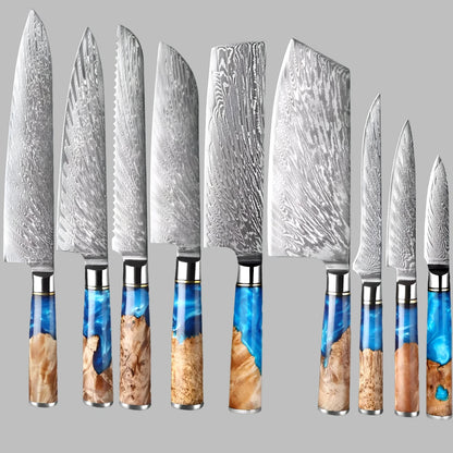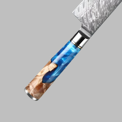 This set of professional Damascus steel knives has a blue resin handle, adding elegance and precision to your kitchen.