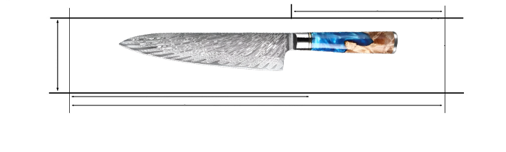 Specifications of the Premium Damascus Steel Knife Set: premium blades that are between 2.0 and 2.2 mm thick, guaranteeing exceptional durability, corrosion resistance, and edge retention.