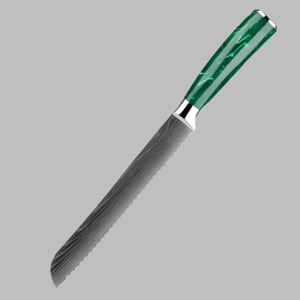 Your kitchen will seem more elegant and precise with the Stainless Steel Laser Damascus Pattern Set. This set is perfect for people who value both use and style because it comes with 10 expertly made knives with laser-etched blade designs and brilliant green resin handles.